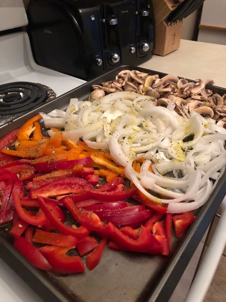- Slice bell peppers, onions, and mushrooms in long slices and spread across a greased sheet pan.